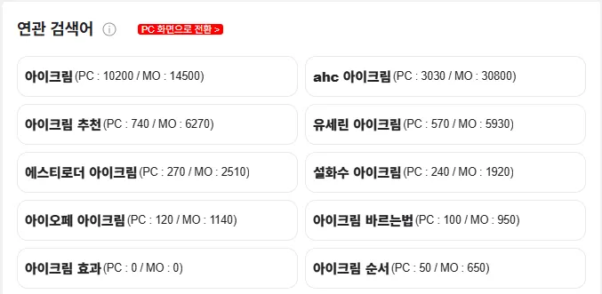 PC와 모바일의 연관 검색어 순서 차이를 꼭 체크하세요.